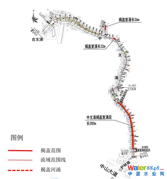 以上為中支涌系統(tǒng)圖。紅色線范圍為工程實(shí)施最為困難的暗涌段,若要實(shí)現(xiàn)綜合整治的目標(biāo),揭蓋復(fù)涌避不開少,也構(gòu)成了項(xiàng)目實(shí)施的最大難點(diǎn)。