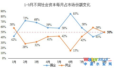 繼8月民企反超國(guó)企占據(jù)固廢市場(chǎng)份額的“大”半壁江山后,據(jù)不完全統(tǒng)計(jì),9月份的固廢市場(chǎng)出現(xiàn)各占“半壁江山”局面。9月份,民企中標(biāo)(含預(yù)中標(biāo))25個(gè)項(xiàng)目,建設(shè)投資總額占固廢市場(chǎng)份額50%;國(guó)企中標(biāo)(含預(yù)中標(biāo))15個(gè)項(xiàng)目,建設(shè)投資總額占固廢市場(chǎng)份額50%。從每月社會(huì)資本中標(biāo)情況分析,國(guó)企的競(jìng)爭(zhēng)優(yōu)勢(shì)大于民企。
