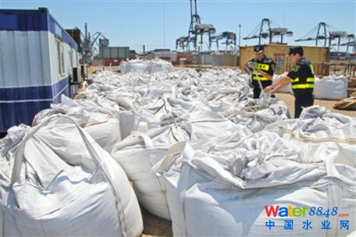 7月2日,在山東煙臺國際集裝箱碼頭,海關(guān)關(guān)員對即將退運(yùn)出境的固體廢物取樣留證。資料圖片/視覺中國
