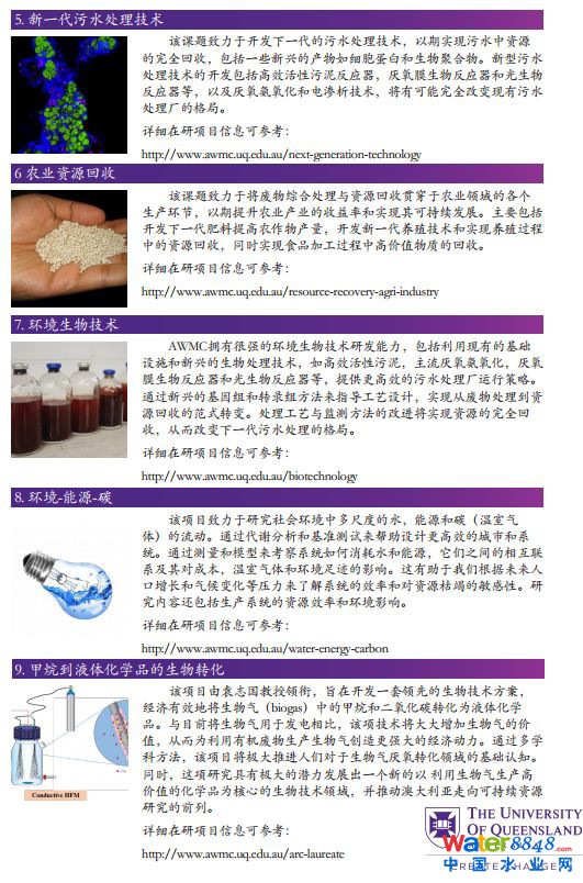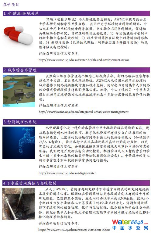 澳大利亞昆士蘭大學昆士蘭大學水管理高等研究中心 (Advanced Water Management Centre,AWMC,http://www.awmc.uq.edu.au) 成立于1996年,是目前國際公認的頂尖水處理技術創(chuàng)新中心之一水管理高等研究中心由澳大利亞工程院院士,國際著名環(huán)境工程專家袁志國教授(Prof. Zhiguo Yuan)領導,主要包括水-健康-環(huán)境關系,城市綜合水管理,智能城市水系統(tǒng),下水道管網(wǎng)腐蝕與臭味控制,新一代污水處理技術開發(fā),農(nóng)業(yè)資源回收,環(huán)境生物技術開發(fā),環(huán)境-能源-碳網(wǎng)絡,甲烷的生物轉(zhuǎn)化等九大研究領域。