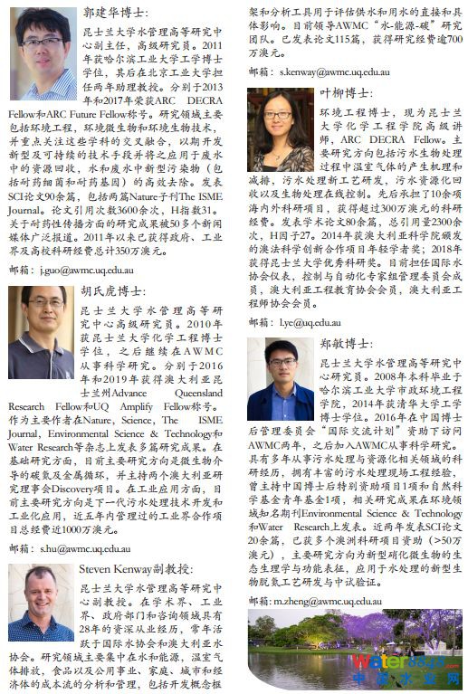核心提示:水管理高等研究中心由澳大利亞工程院院士,國際著名環(huán)境工程專家袁志國教授(Prof. Zhiguo Yuan)領導,主要包括水-健康-環(huán)境關系,城市綜合水管理,智能城市水系統(tǒng),下水道管網(wǎng)腐蝕與臭味控制,新一代污水處理技術開發(fā),農(nóng)業(yè)資源回收,環(huán)境生物技術開發(fā),環(huán)境-能源-碳網(wǎng)絡,甲烷的生物轉(zhuǎn)化等九大研究領域。