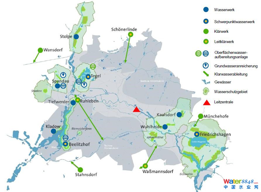 柏林的水循環(huán)體系相對更新速率較慢。因為Spree和Havel河只為柏林城區(qū)提供了較少的水資源,它們通過河岸過濾的方式補充到了飲用水的儲備之中。然而,這兩大河流水量的三分之二其實已經被污水處理廠凈化過一次了。這樣的現狀也對柏林的污水處理廠提出了很高的要求。在非雨期,柏林城區(qū)要產生65萬立方米的污水,在雨期這個數字將要翻倍!為此,6座污水處理廠相應配套而建立,Ruhleben污水廠就是其中最重要的一個。