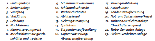 從1989年二月份開始,污水廠啟用了以石灰作為吸附劑的煙氣淋洗設備。為了處理每立方米煙氣中含有的2 500 mg二氧化硫,需要每天使用2.5噸的石灰(其中氧化鈣的質量分數為93 %)。濕式煙氣處理法的產物是石膏,每天大約產生7噸,其中殘留水分含量不足10%。如此之后,煙氣中的二氧化硫含量大概3-5 mg/m3。而過程中產生的石膏也會被回用。