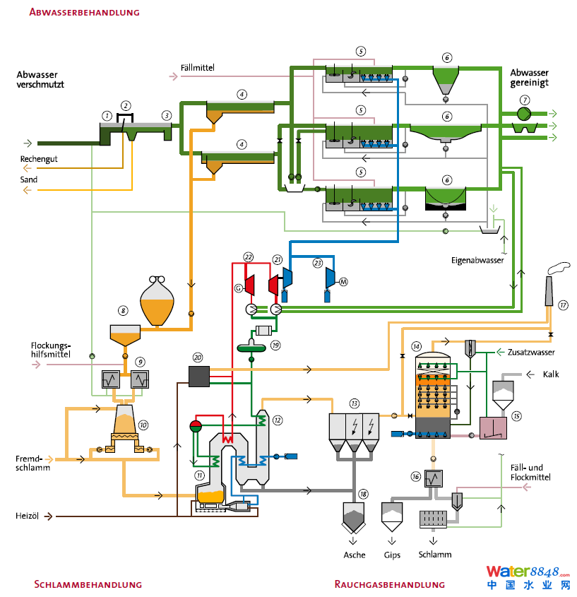 Ruhleben污水廠主要由三大功能單元組成,污水處理單元,污泥處理單元和煙氣處理單元。而其中的污水處理單元又包含了機械處理和生化處理部分。