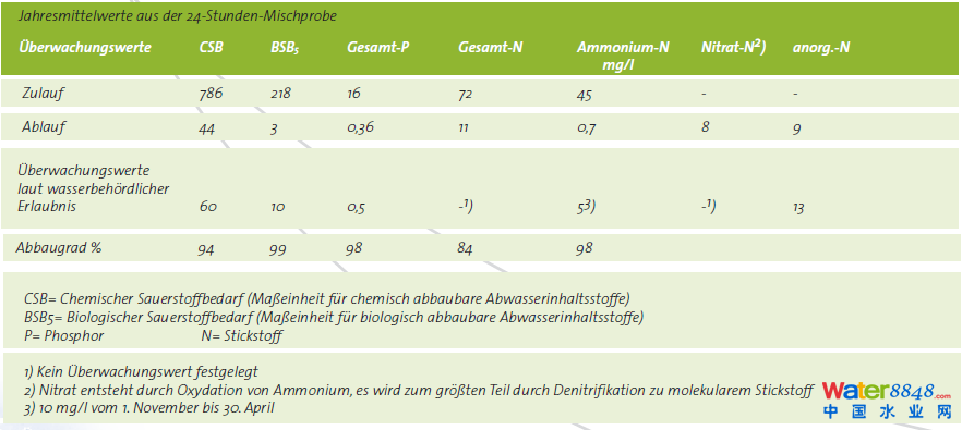 在生化處理環(huán)節(jié),水中的懸浮物,溶解的有機物以及溶解的無機物將會被微生物的新陳代謝過程去除。無機物的進一步去除,是通過特殊的生化反應,或是投加一定的化學藥劑實現的。Ruhleben污水廠的出水中,總磷遠遠低于規(guī)定的0.5 mg/L,氨氮低于5 mg/L,總氮低于13 mg/L。Ruhleben污水廠用三組生化池,分別為一組6個(運行水位3.15 m,容積52500 m3),一組6個(運行水位5.15 m,容積84000 m3),一組4個(運行水位厭氧缺氧區(qū)8.15 m,好氧區(qū)5.65 m,容積62000 m3)。