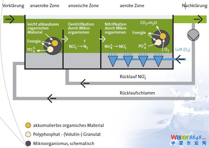 當污水在排水管網中,或者一些特定的池體中停留一定的時間,就會在其中產生可輕易降解的有機酸。這些有機酸可以被微生物(PAO)吸收并轉換成生物內的能量儲存物質。該合成過程所需的能量來自分解儲存在細胞內的多磷酸鹽,同時多磷酸鹽也作為能量來源,支撐細胞在厭氧環(huán)境中的生存。在好氧環(huán)境下,這些之前在厭氧環(huán)境中合成的能量儲存物質以及外部可輕易降解的底物,將會作為細胞繁殖的能量源。通過利用內部的能量儲存物質,可以使細胞快速的適應好氧環(huán)境,同時立刻開始新陳代謝和生長。通過這樣的方式,使得微生物開始吸收水中的磷酸鹽,并將其儲存為多磷酸鹽。并且在好氧環(huán)境下所吸收的磷酸鹽要遠遠多于在厭氧環(huán)境中釋放的磷酸鹽,以此達到除磷的效果。