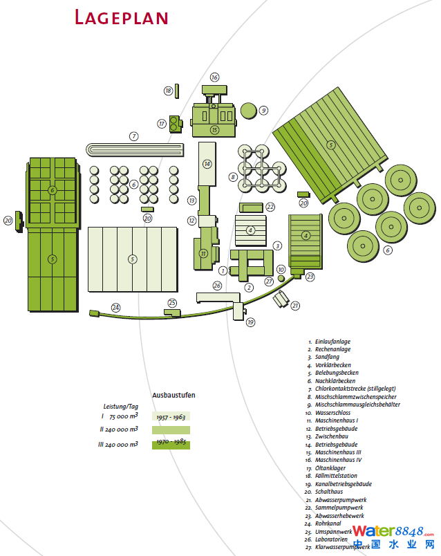 通過現如今的污水廠平面布置圖,我們可以清晰的辨別,污水廠在不同時期分別進行了怎樣的改造升級, 同時我們也會發(fā)現,對于同一處理單元,污水廠也使用了不同的處理工藝。污水廠之所以要如此升級擴建,是為了與柏林的人口規(guī)模相適應,同時也不斷的滿足水務管理部門提出的更加嚴苛的出水標準。