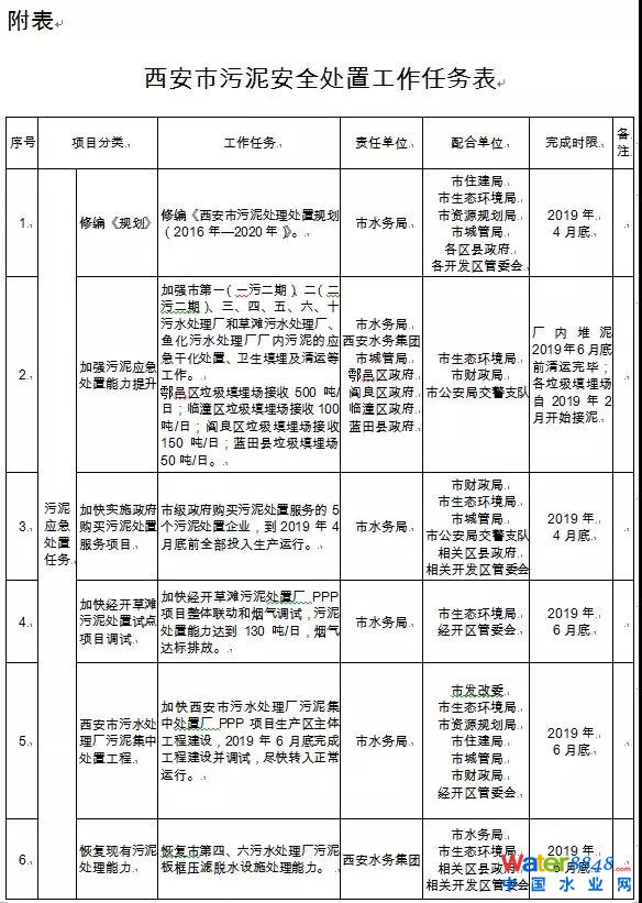 《方案》明確,2019年6月底前完成污水處理廠廠內(nèi)堆存污泥處置和清運(yùn)。西安市水務(wù)局立即啟動(dòng)《西安市污泥處理處置規(guī)劃(2016年—2020年)》修編工作,4月底前完成修編。