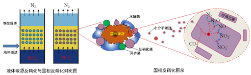 固相反硝化脫氮是指以不溶于水的固相碳源作為反硝化微生物的碳源及生物膜的附著載體,通過微生物自身釋放的胞外酶將固相碳源按需水解為溶解性的小分子有機物,反硝化微生物利用該部分有機物進行生物反硝化過程。