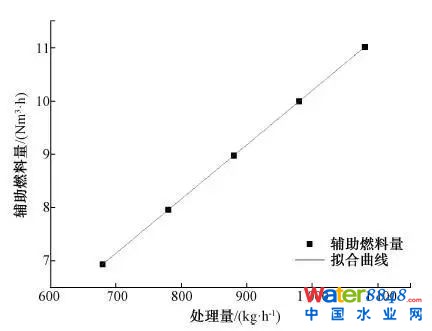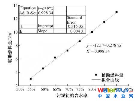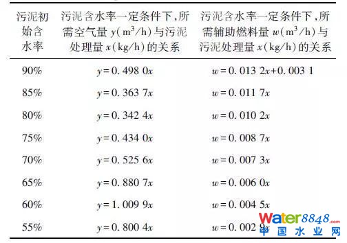 表3給出了不同初始含水率下,輔助燃料消耗量與污泥處理量的相應的關系式。