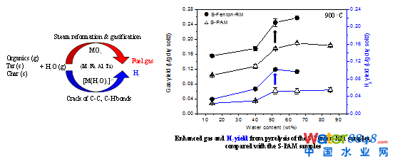 第一篇論文(Jiakuan Yang, Jian Song, Sha Liang*, Ruonan Guan, Yafei Shi, Wenbo Yu, Suiyi Zhu, Wei Fan, Huijie Hou, Jingping Hu, Huali Deng, Bo Xiao . Synergistic effect of water content and composite conditioner of Fenton's reagent combined with red mud on the enhanced hydrogen product ion from sludge pyrolysis. Water Research, 2017, 123: 378-387.),研究發(fā)現(xiàn):添加的堿性含鐵廢渣既在脫水過程中充當(dāng)骨架構(gòu)建體,又在污泥水蒸氣氣化中能有效促進(jìn)氫氣的產(chǎn)率(見圖1)。該研究成果為市政污泥深度脫水泥餅的能源轉(zhuǎn)化提供了新的途徑。
