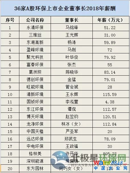 年薪最高800多萬! A股環(huán)保上市公司董事長2018年薪酬大揭秘