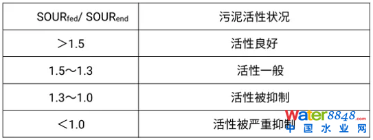 可依據(jù)SOURfed和SOURend的比值判斷污泥活性是否抑制,具體見下表。