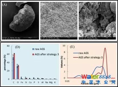 Figure 4SEM image of the surface structure of single GAS after anodic potentialcontrol:(A) an intact granule; (B) high-resolution of SEM image of granularsurface showing the massive microbial colonization; (C) showing the rod-shapemicrobes aligned on the side of deep channels. (D) Energy-dispersive X-ray(EDS) results of AGS before and after strategy 3. (E) Particle size distribution of raw AGS and cultivated AGS afterstrategy 3.