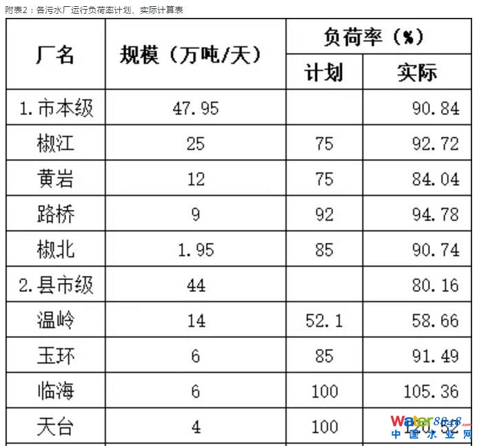 浙江省臺州市城鎮(zhèn)污水處理廠2018年度“三率”情況的通報 污水處理廠運行負荷率不平衡。本年度,平均運行負荷率超過100%的污水廠有臨海、天臺、仙居、院橋污水處理廠,運行負荷率偏低的有溫嶺、江南