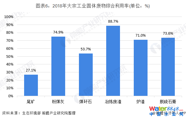 結(jié)合大宗工業(yè)固體廢物產(chǎn)生量來看,2018年大宗工業(yè)固體廢物綜合利用率較高,除尾礦和煤矸石之外,綜合利用率均在70%以上,其中冶煉廢渣綜合利用率較高,達到88.7%。