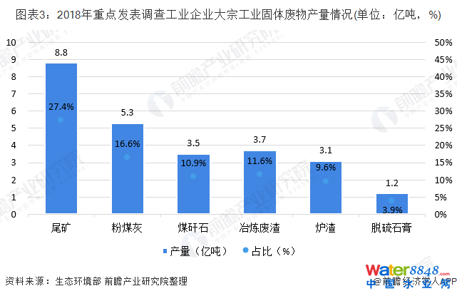 根據(jù)生態(tài)環(huán)境部統(tǒng)計數(shù)據(jù),2018年重點發(fā)表調(diào)查工業(yè)企業(yè)尾礦產(chǎn)生量為8.8億噸,占重點發(fā)表調(diào)查工業(yè)企業(yè)一般固體廢物產(chǎn)生量的27.4%;其次是粉煤灰,產(chǎn)量達到5.3億噸,占比為16.6%;除此之外,產(chǎn)量較大的還有煤矸石、冶煉廢渣以及爐渣,產(chǎn)量均在3億噸以上。