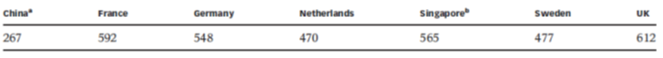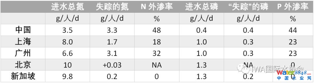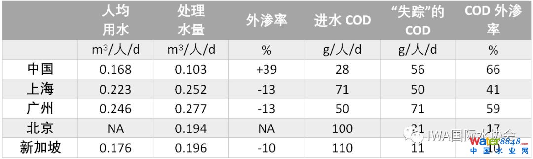初步計(jì)算反映了中國污水管網(wǎng)存在嚴(yán)重的滲漏問題。在這次研究里,他們專門考察了北京、上海和廣州的情況,并和新加坡進(jìn)行對(duì)比。下表是人均用水和滲漏對(duì)比的概況,統(tǒng)計(jì)的都是處理量在10萬m³/天以上的污水廠。