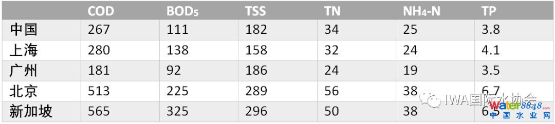 表1. 中國各地區(qū)污水廠進(jìn)水水質(zhì)和新加坡的對(duì)比(單位:mg/L)