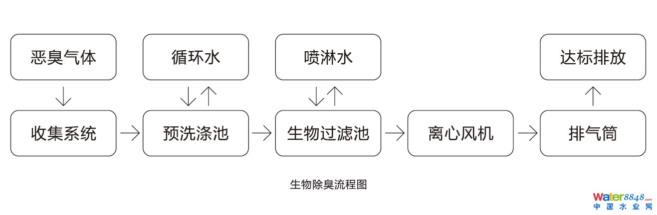 各臭氣源點的臭氣經(jīng)集氣系統(tǒng)負壓收集后,通過離心風機的抽送,被直接導入預洗滌—生物過濾池。前段具有有效除塵、調(diào)節(jié)臭氣的濕溫度、消減峰值濃度沖擊、去除部分水溶性物質(zhì)等功能。在后段的多級生物過濾床內(nèi),通過氣液、液固傳質(zhì)由多種微生物將致臭物質(zhì)降解。