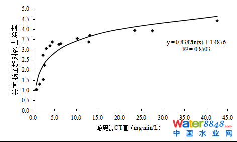 圖5 游離氯CT值與糞大腸菌群對數(shù)去除率的相關(guān)性