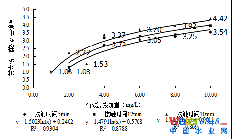 ORP可以反映溶液的氧化還原性。其值越高,溶液的氧化性越強;反之,其值越低,溶液的還原性越強。有文獻報道了ORP值與氯對一些微生物和細菌的殺滅效果高度相關(guān)。本研究表明,糞大腸菌群對數(shù)去除率與反應(yīng)后水樣的ORP值呈現(xiàn)較好的對數(shù)相關(guān)性,如圖3所示,接觸時間5、12、30 min的相關(guān)系數(shù)(R)值分別為0.8680、0.7971、0.8706,推測出現(xiàn)這一相關(guān)性正是由于水中投加了次氯酸鈉這類氧化劑后,引起水質(zhì)的氧化還原電位發(fā)生了改變?紤]到糞大腸菌群數(shù)等致病微生物指標的檢測周期一般需要48h,目前部分歐美發(fā)達國家已普遍采用ORP值控制泳池水的消毒效果。因此為簡單快速預(yù)判污水處理廠出水糞大腸菌群的去除效果,建議在出水排放口處安裝在線ORP儀以輔助判斷消毒效果。