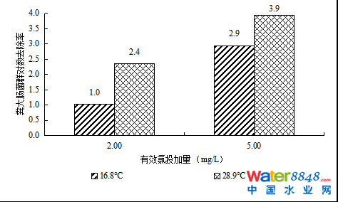 試驗水樣中有效氯投加量為2 mg/L和5 mg/L時,分別在水溫為16.8 ℃和28.9 ℃下接觸消毒5 min,結(jié)果如圖6所示,可見水溫對糞大腸菌群對數(shù)去除率有顯著影響。在相同的有效氯投加量下,水溫升高可明顯提高糞大腸菌群對數(shù)去除率,這可能是由于溫度的提升使得次氯酸擴散至微生物表面的速率變快,進而提高了穿透細胞壁發(fā)生氧化作用使其死亡的概率。因此在為了達到近似的糞大腸菌群對數(shù)去除率的前提下,夏季水溫較高時可適當(dāng)減少次氯酸鈉的投加量;而在冬季水溫較低的環(huán)境下,可通過加大有效氯投加量或者適當(dāng)延長接觸時間達到相同的消毒效果。