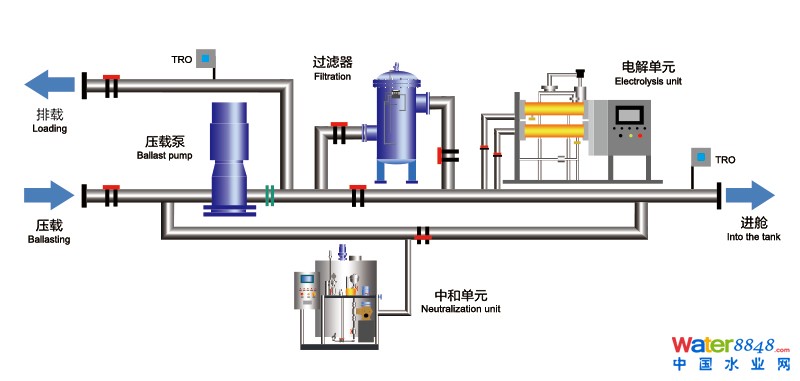 第2步:“電解海水產(chǎn)生次氯酸鈉殺菌”– 從壓載水主管路取一個(gè)小流量的海水流過電解裝置,電解產(chǎn)生高濃度的次氯酸鈉溶液,該溶液經(jīng)過除氣后,回注入壓載水主管路,同主管路壓載水混合稀釋至特定濃度。該濃度的次氯酸鈉能夠有效殺滅經(jīng)過濾后的殘余的浮游生物、病原體及其幼蟲或孢子等,達(dá)到規(guī)定的殺菌效果(D-2以及其他標(biāo)準(zhǔn)),壓載水管路中活性物質(zhì)的濃度由TRO分析儀和控制系統(tǒng)自動(dòng)控制;