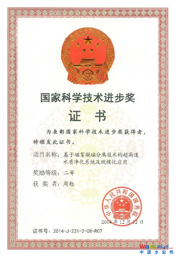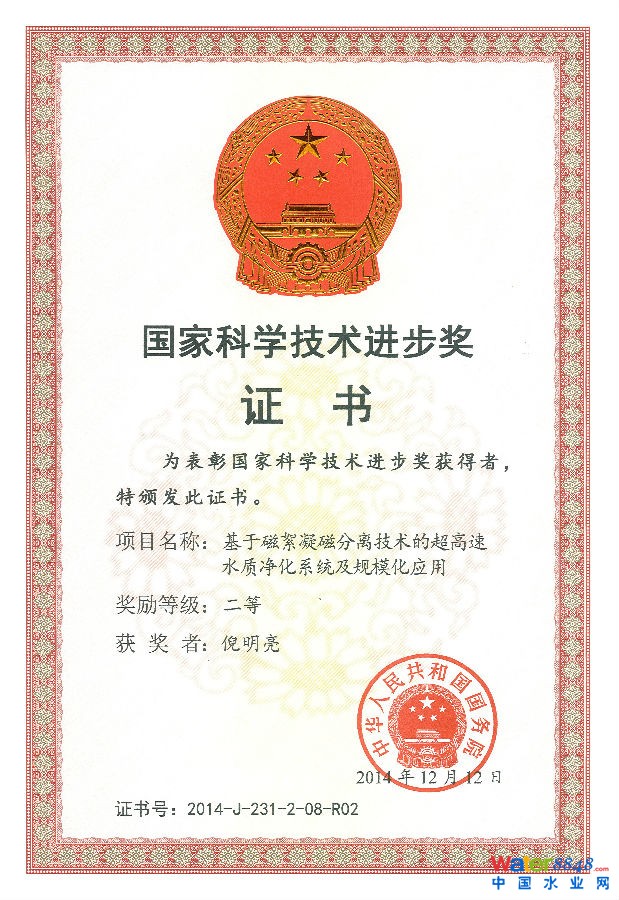 我公司憑借“基于磁絮凝磁分離技術(shù)的超高速水質(zhì)凈化系統(tǒng)及規(guī);瘧(yīng)用”項(xiàng)目,獲得了國家科學(xué)技術(shù)進(jìn)步二等獎(jiǎng)。此次獲獎(jiǎng)是我公司首次獲得國家級科學(xué)技術(shù)類獎(jiǎng)項(xiàng),體現(xiàn)了國家與社會(huì)對公司多年來傾心打造的核心技術(shù)的認(rèn)可,也是對公司長期在環(huán)境保護(hù)領(lǐng)域做出杰出貢獻(xiàn)的鼓勵(lì)和支持。