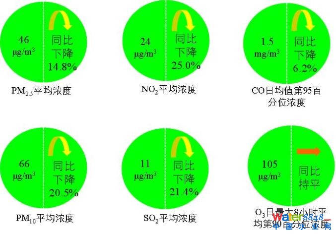 1-3月,全國(guó)337個(gè)地級(jí)及以上城市平均優(yōu)良天數(shù)比例為83.5%,同比上升6.6個(gè)百分點(diǎn);120個(gè)城市環(huán)境空氣質(zhì)量達(dá)標(biāo),同比增加24個(gè);PM2.5濃度為46微克/立方米,同比下降14.8%;PM10濃度為66微克/立方米,同比下降20.5%;O3濃度為105微克/立方米,同比持平;SO2濃度為11微克/立方米,同比下降21.4%;NO2濃度為24微克/立方米,同比下降25.0%;CO濃度為1.5毫克/立方米,同比下降6.2%。