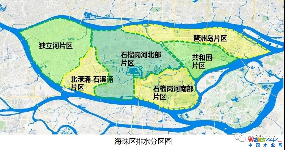 為實(shí)現(xiàn)海綿城市專項規(guī)劃與海珠區(qū)現(xiàn)狀基礎(chǔ)設(shè)施和現(xiàn)行規(guī)劃的有效銜接,規(guī)劃沿用《廣州市海綿城市專項規(guī)劃》中對排水分區(qū)的劃分方法,共劃分為6個排水分區(qū),分別為北濠石溪片區(qū)、石榴崗河北片區(qū)、石榴崗河南片區(qū)、琶洲片區(qū)、共和圍片區(qū)和獨(dú)立河片區(qū)。