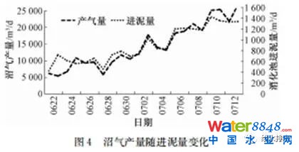 通過(guò)對(duì)消化系統(tǒng)沼氣產(chǎn)量隨消化池進(jìn)泥量變化分析表明,如圖4所示,經(jīng)過(guò)熱水解后的污泥可以有效縮短水解周期,從而提高厭氧消化性能,使得消化池內(nèi)產(chǎn)氣速率較快,隨著進(jìn)泥負(fù)荷的提升,沼氣產(chǎn)量也隨之增加。目前,所產(chǎn)沼氣主要用于廠內(nèi)沼氣鍋爐燃燒產(chǎn)生蒸汽供熱水解利用,多余沼氣通過(guò)廢氣燃燒器處理。