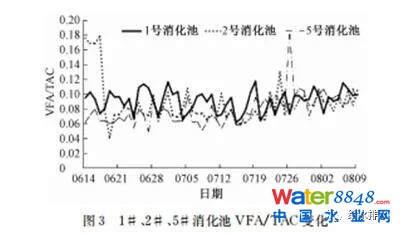 酸堿比即VFA/TAC和沼氣中CH4含量是判斷消化系統(tǒng)運(yùn)行是否穩(wěn)定重要指標(biāo),正常運(yùn)行時(shí),VFA/TAC一般<0.3。當(dāng)VFA/TAC>0.3并繼續(xù)升高時(shí),預(yù)示系統(tǒng)運(yùn)行可能出現(xiàn)異常,VFA將會(huì)不斷增高,隨之pH出現(xiàn)下降。圖3為1#、2#、5# 3座消化池VFA/TAC變化情況。3座消化池VFA/TAC基本維持在0.1左右,未出現(xiàn)>0.3的情況,表明調(diào)試運(yùn)行期間系統(tǒng)運(yùn)行比較穩(wěn)定。