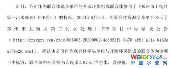 城發(fā)環(huán)境聯(lián)合體中標(biāo)污水處理廠PPP項(xiàng)目 聯(lián)合體中標(biāo)金額為2.97元/立方米