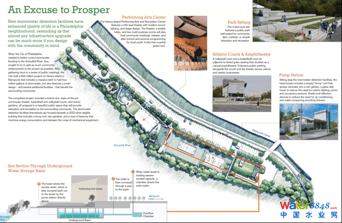 此外,本報(bào)告還將對費(fèi)城西部的一個(gè)改造項(xiàng)目進(jìn)行簡要介紹(威尼斯島Venice Island),該項(xiàng)目雖小但是包含了低影響開發(fā),最優(yōu)管理措施和雨水設(shè)備,MS4管理,CSO調(diào)蓄池,泵站等諸多元素。