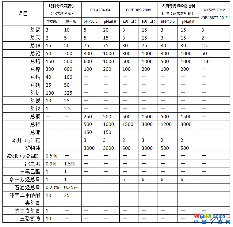 2.1發(fā)展歷程污泥農(nóng)用標(biāo)準(zhǔn)按照角度不同分為兩個(gè)體系:(1)原料角度污泥農(nóng)用標(biāo)準(zhǔn)制定起始于1984年,由當(dāng)時(shí)國務(wù)院環(huán)境保護(hù)小組提出,農(nóng)牧漁業(yè)部環(huán)境保護(hù)科研監(jiān)測所、中國農(nóng)業(yè)大學(xué)編制的GB 4284-84《農(nóng)用污泥中污染物控制標(biāo)準(zhǔn)》,第一次從污染物控制角度對(duì)污泥中9種重金屬、2種有機(jī)污染物指標(biāo)提出了限值要求,上述指標(biāo)也成為后來編制污泥標(biāo)準(zhǔn)的基礎(chǔ)依據(jù)。2009年住建部發(fā)布實(shí)施CJ/T 309-2009《城鎮(zhèn)污水處理廠污泥處置 農(nóng)用標(biāo)準(zhǔn)》,對(duì)8種重金屬、3種有機(jī)污染物指標(biāo)提出了限值要求,并加入了養(yǎng)分指標(biāo);同年3月,在該基礎(chǔ)上編制的國家標(biāo)準(zhǔn)(征求意見稿)發(fā)布,但時(shí)至今日仍未獲批準(zhǔn)。(注:2007-2009年,住建部先后發(fā)布實(shí)施了八項(xiàng)污泥處理處置相關(guān)行業(yè)標(biāo)準(zhǔn),其中七項(xiàng)獲批轉(zhuǎn)化為國家標(biāo)準(zhǔn))2017年11月12日,在上述標(biāo)準(zhǔn)基礎(chǔ)上修改而成的《農(nóng)用污泥污染物控制標(biāo)準(zhǔn)(征求意見稿)》向全社會(huì)征求意見,同樣對(duì)8種重金屬、3種有機(jī)污染物指標(biāo)提出了限值要求,較CJ/T 309-2009更加嚴(yán)格。(2)產(chǎn)品角度2002年,農(nóng)業(yè)部組織全國農(nóng)業(yè)技術(shù)推廣中心、南京農(nóng)業(yè)大學(xué)等單位編制實(shí)施了NY525《有機(jī)肥料》標(biāo)準(zhǔn),主要規(guī)定有機(jī)肥料的技術(shù)指標(biāo)(養(yǎng)分指標(biāo)),在污染物控制指標(biāo)方面引用了GB8172《城鎮(zhèn)垃圾農(nóng)用控制標(biāo)準(zhǔn)》;2011、2012兩個(gè)修訂版本則不再引用,改為直接規(guī)定5項(xiàng)重金屬指標(biāo)限值,較2002版更加嚴(yán)格。與NY525類似,2002年,農(nóng)業(yè)部組織編制實(shí)施了GB18877《有機(jī)-無機(jī)復(fù)混肥料》標(biāo)準(zhǔn),在污染物控制指標(biāo)方面引用了GB8172標(biāo)準(zhǔn),2009修訂版改為直接規(guī)定5項(xiàng)重金屬指標(biāo)限值,要求也與NY525-2012相同。從上述簡要描述可以看出,產(chǎn)品、原料體系長期不接口,污泥“限制性”標(biāo)準(zhǔn)長期不統(tǒng)一,是農(nóng)業(yè)農(nóng)用被限制的根本原因。2017年12月4日,工業(yè)和信息化部網(wǎng)站刊登了《肥料分級(jí)及要求》強(qiáng)制性國家標(biāo)準(zhǔn)報(bào)批公示,為上述矛盾的終結(jié)帶來“曙光”。新標(biāo)準(zhǔn)將肥料分為三個(gè)等級(jí):生態(tài)級(jí)肥料、農(nóng)田級(jí)肥料、園林級(jí)肥料,其中園林級(jí)肥料明確“可使用固體廢物作為原料”,并詳細(xì)規(guī)定了污染物指標(biāo)體系,為“限制性”提供了可操作依據(jù)。2.2標(biāo)準(zhǔn)限值分析污泥農(nóng)業(yè)的風(fēng)險(xiǎn)在于其中所含污染物,《肥料分級(jí)及要求》規(guī)定:農(nóng)田級(jí)肥料和生態(tài)級(jí)肥料的有害物質(zhì)限量“應(yīng)符合表1要求,同時(shí)還應(yīng)符合相應(yīng)的國家標(biāo)準(zhǔn)、行業(yè)標(biāo)準(zhǔn)要求”,表1規(guī)定了11項(xiàng)重金屬指標(biāo),相對(duì)于之前的相關(guān)污泥及肥料標(biāo)準(zhǔn),增加了鈷、硒、釩、銻、鉈等指標(biāo),取消了銅、鋅、硼等指標(biāo);表1規(guī)定了8項(xiàng)有機(jī)污染物指標(biāo),相對(duì)于之前標(biāo)準(zhǔn)增加了氟化物(水溶性氟)、縮二脲、三氯乙醛、鄰苯二甲酸酯類總量、抗生素總量、三聚氰胺,而石油烴總量代替礦物油,多環(huán)芳烴總量由于包含本并(a)芘而不再單獨(dú)設(shè)指標(biāo)限值。