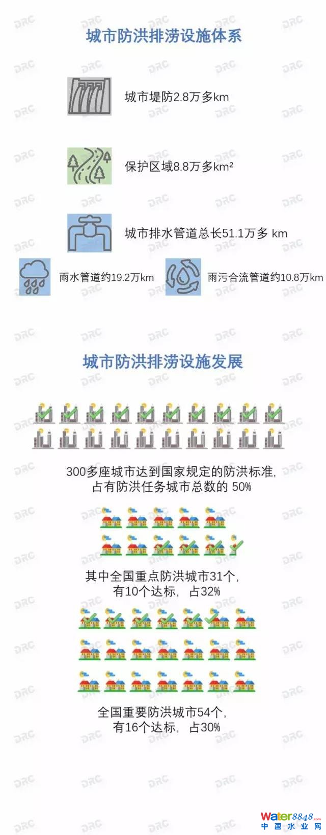 但我國(guó)各城市防洪排澇設(shè)施發(fā)展并不平衡,目前只有300多座城市達(dá)到國(guó)家規(guī)定的防洪標(biāo)準(zhǔn),占有防洪任務(wù)城市總數(shù)的50%,其中全國(guó)重點(diǎn)防洪城市31個(gè),有10個(gè)達(dá)標(biāo),占32%;全國(guó)重要防洪城市54個(gè),有16個(gè)達(dá)標(biāo),占30%。盡管全國(guó)城市排水管道總長(zhǎng)比1978年增加了26倍,但城市管線系統(tǒng)排水能力仍不足,絕大多數(shù)不足1年一遇。2013年9月,國(guó)務(wù)院印發(fā)了《關(guān)于加強(qiáng)城市基礎(chǔ)設(shè)施建設(shè)的意見》(國(guó)發(fā)[2013]36號(hào)),要求用10年左右時(shí)間建成較完善的城市排水防澇、防洪工程體系。