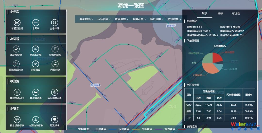 本項(xiàng)目以“2個(gè)平臺——1個(gè)中心+5個(gè)應(yīng)用系統(tǒng)”的構(gòu)架思路,建立了一整套可評估、可追溯的海綿城市一體化管控平臺,結(jié)合地理信息技術(shù)、在線監(jiān)測技術(shù)和TMDL思路,實(shí)現(xiàn)了三亞市海綿城市從規(guī)劃、設(shè)計(jì)、施工到運(yùn)營的全生命周期智慧化評估和管控。