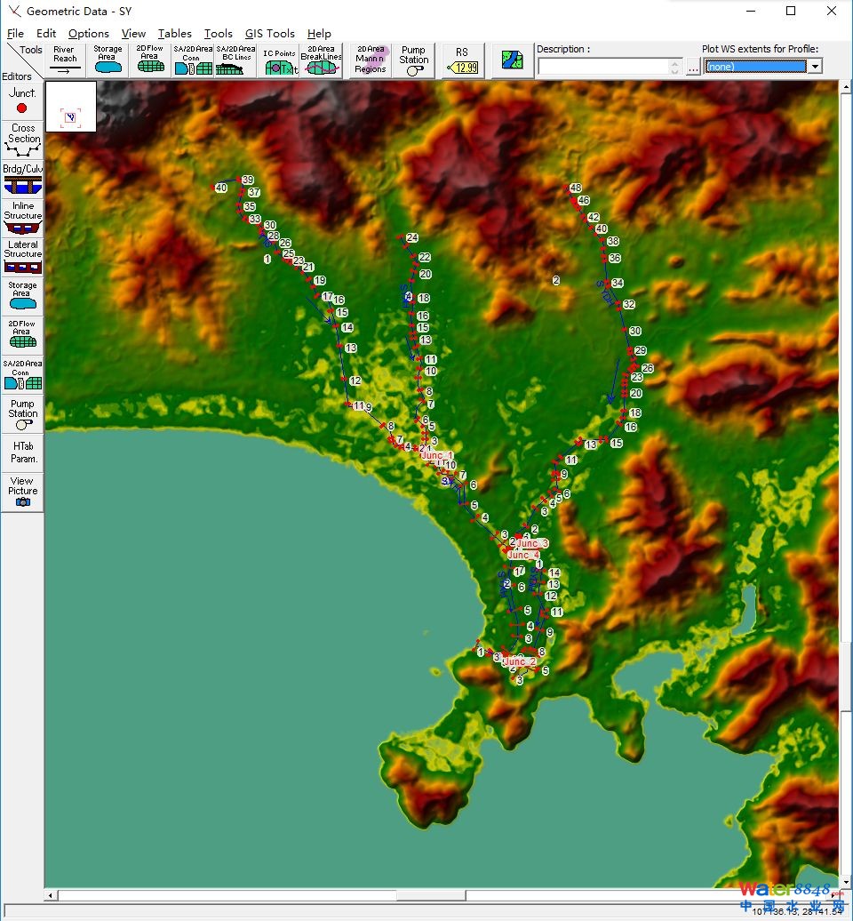 基于先進(jìn)的TMDL理念構(gòu)建了三亞流域-排水管網(wǎng)-河網(wǎng)耦合模型,綜合評估三亞市海綿城市現(xiàn)狀條件并為內(nèi)澇預(yù)警、設(shè)計(jì)方案評估提供決策依據(jù)。其中包括:350平方公里的流域模型;80個(gè)海綿城市建設(shè)項(xiàng)目模型;31.5km2的城市建成區(qū)排水管網(wǎng)模型;3條河道(湯他水、三亞西河、三亞東河)的河道水動力水質(zhì)模型。