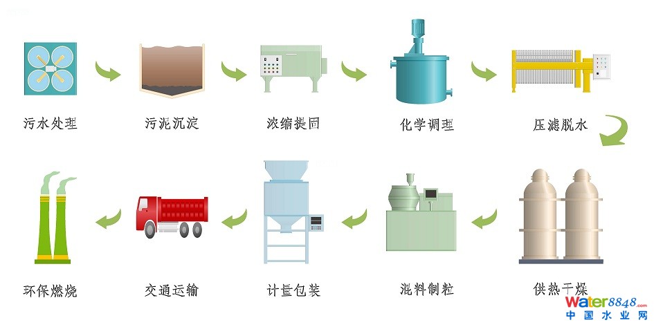 澤源污泥能源化處理處置技術是指將污水廠儲泥池內(nèi)含水率高達98%的污泥通過污泥泵直接泵進由澤源公司自主研發(fā)、獨家制造生產(chǎn)的污泥能源化智能集成系統(tǒng),首先向進入系統(tǒng)的污泥加入由澤源公司自主研發(fā)的污泥專用改性劑,經(jīng)過一系列的物理和化學反應,破壞細胞壁,釋放結合水、吸附水和細胞內(nèi)部水,改善污泥的脫水性能,并改善污泥及其組分的物理、化學性質(zhì),然后通過澤源公司污泥專用壓濾機進行機械脫水,使污泥含水率降低至50%以下,低含水率的污泥進入澤源公司研制的低溫負壓干燥機進行干燥,最后添加生物質(zhì)助燃劑并經(jīng)造粒機進行造粒,生產(chǎn)出新型的潔凈環(huán)保燃料,再銷售給各燃料用戶。