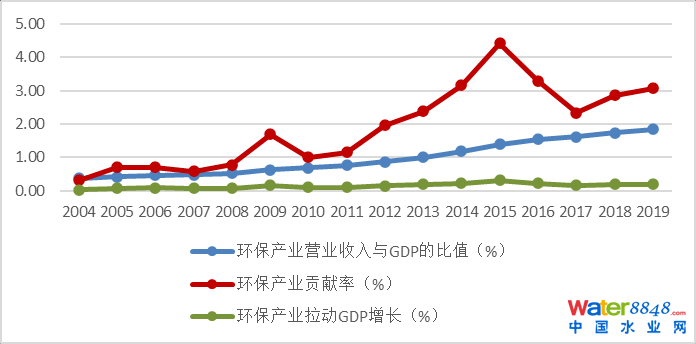 2004—2019年,我國環(huán)保產(chǎn)業(yè)營(yíng)業(yè)收入與國內(nèi)生產(chǎn)總值(GDP)的比值從2004年的0.4%逐步擴(kuò)大到2019年的1.8%。環(huán)保產(chǎn)業(yè)對(duì)國民經(jīng)濟(jì)直接貢獻(xiàn)率從2004年的0.3%上升到2019年的3.1%,盡管期間出現(xiàn)過一些波動(dòng),但環(huán)保產(chǎn)業(yè)對(duì)國民經(jīng)濟(jì)的貢獻(xiàn)總體呈逐步加大的趨勢(shì)。