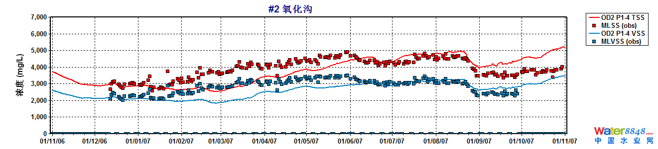 通過對該污水廠過去一年的數(shù)據(jù)的分析和補充實驗數(shù)據(jù)的分析,確定了污水處理廠進水水質(zhì)組分,并調(diào)整參數(shù)對模型進行了校正。校正后的模型可以較好地模擬一年內(nèi)污水廠的運行情況。