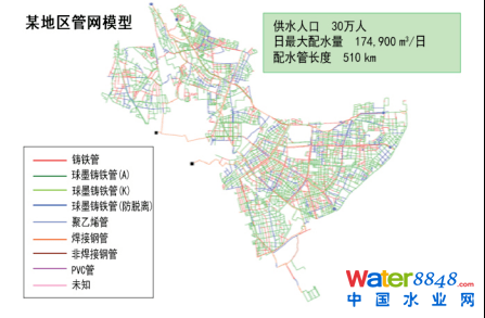 傳統(tǒng)的供水管網(wǎng)主要是鐵質(zhì)管道、鍍鋅鋼管等,老化后容易發(fā)生漏損現(xiàn)象,產(chǎn)生紅水等水質(zhì)問(wèn)題。后來(lái),為預(yù)防管網(wǎng)漏損,開(kāi)始逐漸使用球墨鑄鐵管道替換鐵質(zhì)管道。目前,在日本主要的水管材料中,球墨鑄鐵管的比重最大,其次分別是硬質(zhì)氯乙烯管(PVC管),聚乙烯管和鋼管等。球墨鑄鐵管和硬質(zhì)氯乙烯管材用量占總管長(zhǎng)的88%。日本某地區(qū)供水管網(wǎng)模型見(jiàn)圖1。