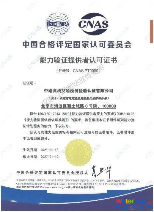 2021年1月13日,中路檢測(國家道路及橋梁質量監(jiān)督檢驗中心)成功獲得由中國合格評定國家認可委員會(CNAS)頒發(fā)的能力驗證提供者認可證書,這標志著中路檢測(國家道路及橋梁質量監(jiān)督檢驗中心)成為交通行業(yè)內第一家“能力驗證提供者”PTP。