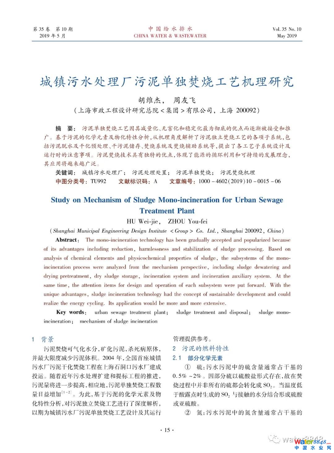 胡維杰總工:城鎮(zhèn)污水處理廠污泥單獨焚燒工藝機理研究 來源:中國給水排水 作者:胡維杰等