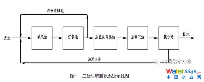 事實上經(jīng)過單級生物脫氮處理后,出水中仍會含有一定量的硝酸鹽,尤其是進水氨氮濃度高的情況下,出水中硝酸鹽的含量會更高,總氮也相應(yīng)偏高。在出水對總氮有嚴格要求的地區(qū),為保證出水總氮達標,在單級生物脫氮后再增設(shè)后置反硝化池和后曝氣池,亦即二級生物脫氮系統(tǒng),通過投加外加碳源,利用微生物的硝化和反硝化反應(yīng)進一步去除剩余的硝酸鹽,進而達到提高總氮去除率的目的。