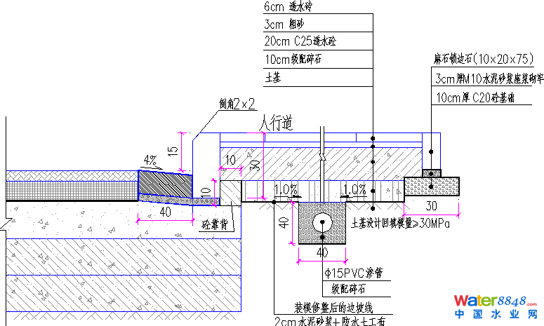 3) 本道路無綠化帶,海綿城市主要是采用透水人行道。將人行道建設(shè)成透水結(jié)構(gòu),人行道與車行道之間采用防滲膜進行隔離。人行道路面結(jié)構(gòu)為:透水磚6cm、中粗砂3cm、透水水泥砼C25 20cm、開級配碎石10cm。
