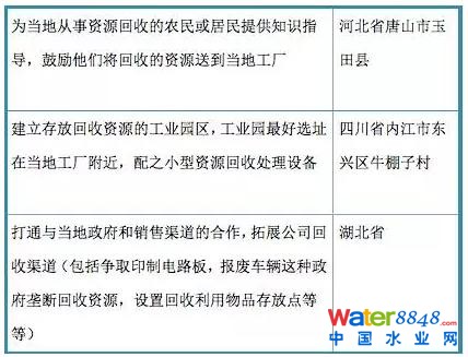 在我看來,想要進軍中國環(huán)境市場,日本的“靜脈企業(yè)”就要做好應(yīng)對諸多挑戰(zhàn)的準(zhǔn)備。這些企業(yè)要搜集足夠多的“靜脈資源”(venousresources),如再生產(chǎn)品(postconsumerproducts)、零件、材料等,而收集這些材料涉及到國家體制機制層面,這不僅對日本企業(yè)來說是一個挑戰(zhàn),對中國亦是如此。首先,中國廢物回收利用的相關(guān)法律法規(guī)還不完善,執(zhí)行力也有待加強;其次,因歷史,權(quán)責(zé)劃分不明等原因,一些政府部門和組織會介入,干涉甚至?xí)钃腺Y源回收項目的進程;再次,靜脈資源的生產(chǎn)或分配遠(yuǎn)遠(yuǎn)快于處理設(shè)備的建設(shè)速度。此外,公眾和企業(yè)對資源回收利用意識淡薄也是一方面。如今,很多中國大型企業(yè)正試圖努力改變現(xiàn)狀,具體舉措見下表。