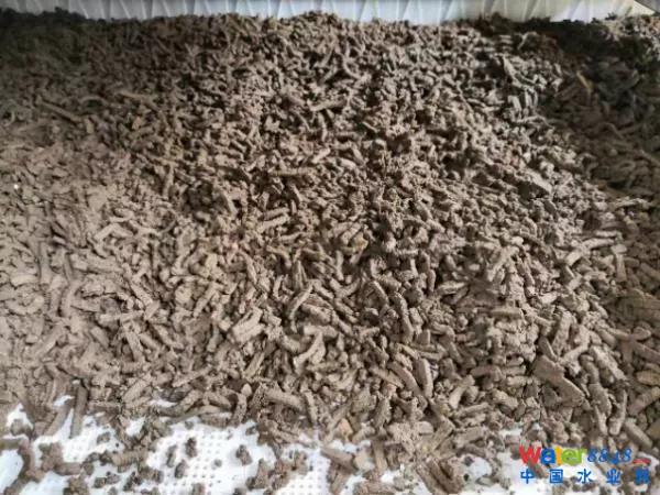 深度脫水后含水率60%左右的污泥在帶式熱泵低溫干化設(shè)備的入口經(jīng)面條機(jī)擠壓成約4~6mm直徑的圓柱條狀,再進(jìn)入網(wǎng)帶連續(xù)低溫除濕干燥箱。在網(wǎng)帶運(yùn)轉(zhuǎn)污泥緩緩轉(zhuǎn)運(yùn)過(guò)程中,圓柱條狀的深度脫水污泥均勻攤鋪在網(wǎng)帶輸送機(jī)上。60~70℃的熱空氣從網(wǎng)帶下方經(jīng)網(wǎng)眼向上通過(guò),使污泥與熱空氣產(chǎn)生熱質(zhì)交換,從而將污泥中水分蒸發(fā)帶出。吸收了污泥中水分的40~50℃濕熱空氣再進(jìn)入除濕熱泵中進(jìn)行除濕與加熱處理,處理后熱干空氣循環(huán)對(duì)網(wǎng)帶上污泥進(jìn)行干化,干化后污泥外觀如圖4呈直徑4mm左右的細(xì)顆粒狀,干化后污泥含水率降低至40%以下,最后與垃圾摻燒處置。