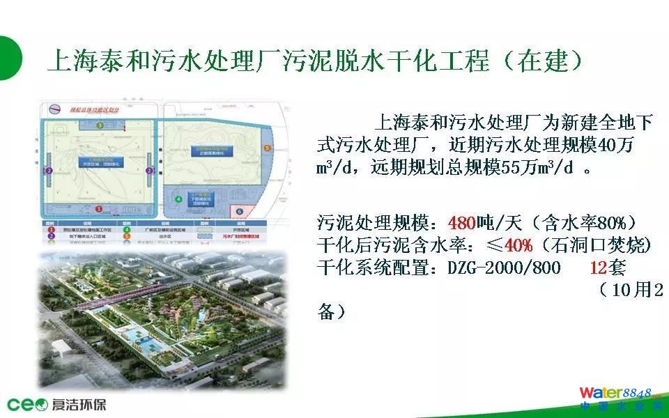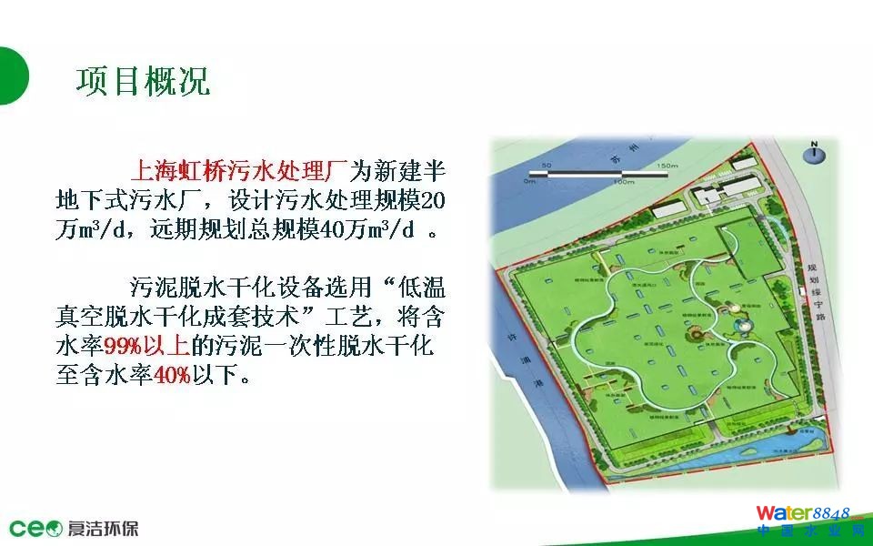 接下來,我重點(diǎn)分享一下在上海做的虹橋污水處理廠污泥深度處理的項(xiàng)目,大家看一下效果圖,現(xiàn)在已經(jīng)建成了,目前處在調(diào)試階段。這個(gè)項(xiàng)目是新建的,半地下式的污水處理廠,設(shè)計(jì)的規(guī)模近期20萬(wàn)噸,遠(yuǎn)期40萬(wàn)噸每天。污泥的脫水干化設(shè)備選擇低溫真空脫水干化成套技術(shù)裝備,從99%的含水率污泥一次性降低到40%以下的要求。